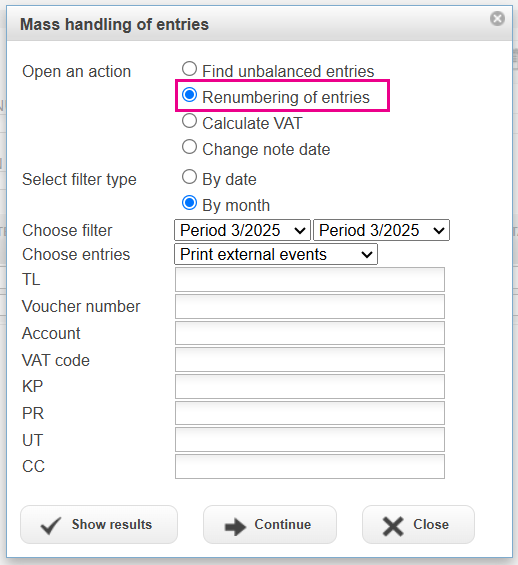 At least a date or a seasonal interval (month) must be provided as selection criteria. In addition, other selection criteria can be provided as needed, such as voucher number, voucher type, account, VAT code, and/or possible cost centers. The Show button displays the entries that meet the provided selection criteria in the Open view. This allows for verifying that the selection criteria are correct.