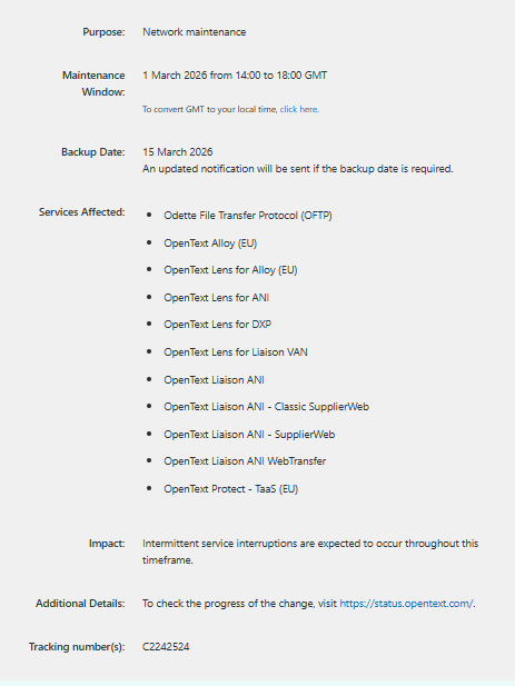 E-invoice operator Opentext has announced that it will carry out network maintenance in its environment on Sunday 1 March 2026, during which intermittent disruptions may occur in message traffic.