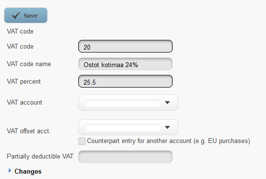 If you use VAT codes, you need to either create them one by one or import them from another system as a csv file. We recommend using codes as they also include the VAT rate. Depending on the interface of the core system, the transfer file will include either the VAT code or the VAT rate.