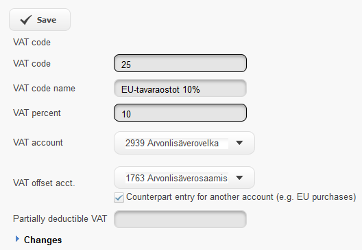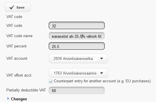 Select the counter account to be used if necessary for the VAT code being set up by clicking the dropdown menu at the end of the field and selecting the account to be used from the chart of accounts listing. Note! The account must be established in the Registers – Chart of Accounts view. Take into account the checkmark for Counterpart entry to another account.