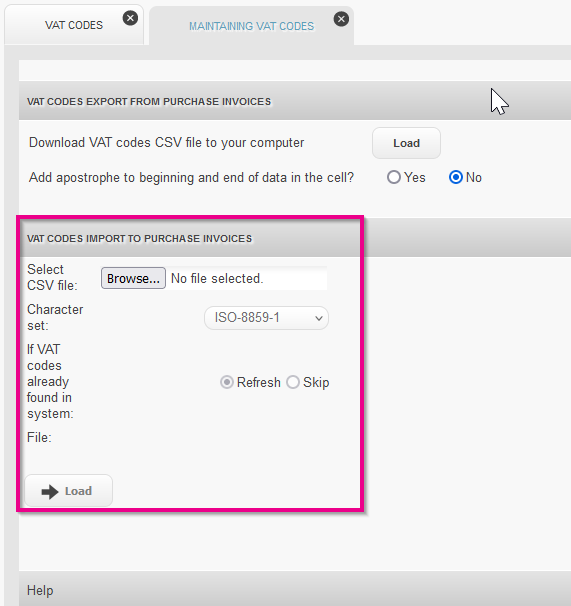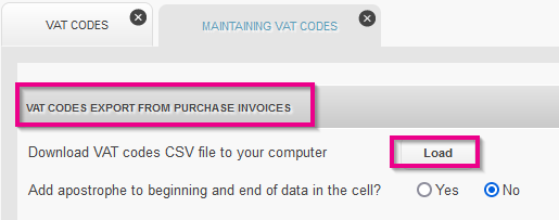 - In the section VAT codes export from Purchase Invoices click Load