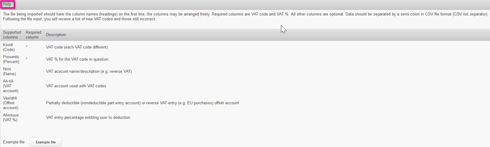 The import file must have the column names (headers) on the first row, the order of the columns is flexible. Mandatory columns are VAT code and VAT percentage. Other columns are optional. The data must be saved in a semi-colon separated csv file format (csv list separator).