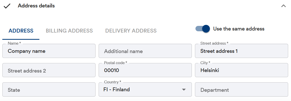 Use the same address - While option is selected, the Address information is also copied to the Billing address and Delivery address tabs. By removing the selection, you can move to the tabs and edit the address information.