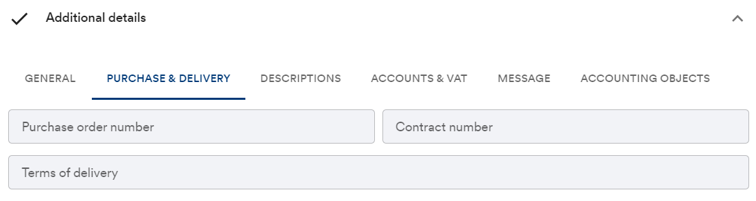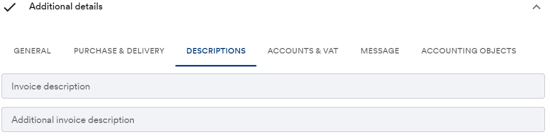 Invoice description, Additional invoice description - The Additional invoice description field can be utilized in cases where the invoice remark varies by customer. NOTE! The Finvoice file contains character restrictions for the description fields. The maximum character limit for the Additional invoice description field is 80 characters, so longer remarks should always be written in the Invoice description field (maximum character limit 512).