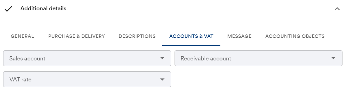Sales account, Receivable account, and VAT rate - Customer-specific accounts and VAT rates can be specified.