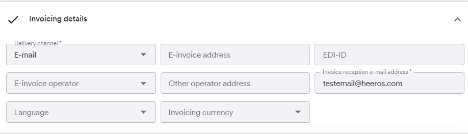 E-invoice address and EDI-ID - Fill in the E-invoice address if the invoices are sent as E-invoices. EDI-ID can also be added, but field is not mandatory.