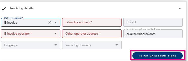If the country is Finland and the invoice delivery channel is e-invoice, the Fetch data from TIEKE button will be activated. Pressing this button will retrieve the e-invoice address specified for the customer from the e-invoice address list of TIEKE.
