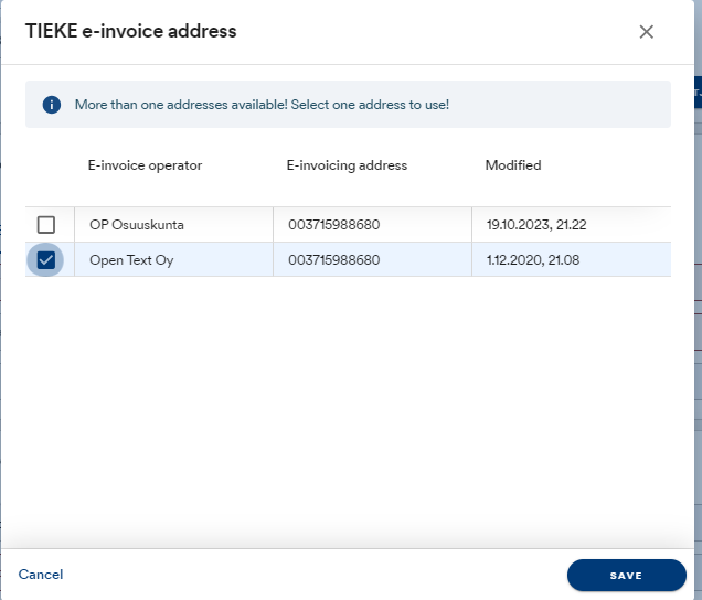 If there is more than one e-invoice address for a customer in the TIEKE register, a selection form will open.