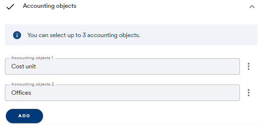 Accounting object types are created in the accounting objects section, which are then used in different sections of the Sales Invoices program. Actual accounting objects are added in the accounting object register Registers - Accounting Objects, from where they can be selected for customer, product, and invoice forms.