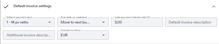 Default Invoice Description and Additional Invoice Description - Default descriptions and additional descriptions can be defined for invoices. NOTE! The Finvoice file has character restrictions for description fields. The maximum number of characters for the additional description field is 80, so longer descriptions should always be written in the Description field (maximum 512 characters).