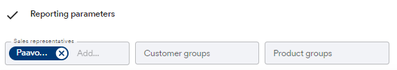 If necessary, sales representatives, customer groups, and product groups can be added to the reporting parameters. Sales representatives can be selected behind a customer in the customer register or on an invoice form when creating a new invoice. Created customer groups can be added behind customers, and product groups can be added behind products. Add a new sales representative by entering the name, for example, Maija Seller, in the Sales representatives field and selecting ENTER from the keyboard. Information is added to the Customer Groups and Product Groups fields in the same way.