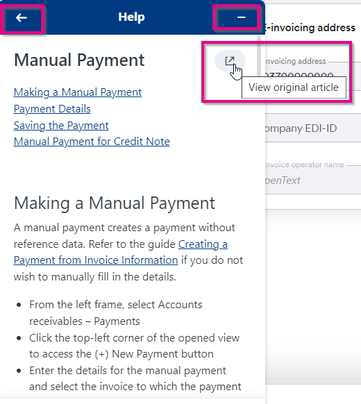 The arrow takes you back to the chatbot discussion. The minimize button (-) closes the chatbot. The "View original article" button takes you to the HelpCenter.