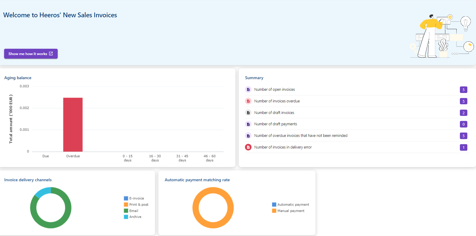 - Summary shows the numbers of different documents, such as the number of open invoices, the number of overdue invoices, invoices with delivery errors, etc.