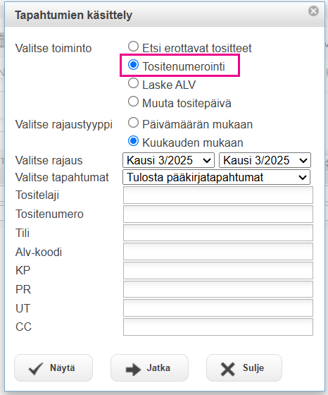 Klikkaamalla uudelleen Tapahtumien käsittely –painiketta, muistaa ohjelma aiemmin annetut valinnat ja rajaustekijät. Jatka -painike aloittaa tositenumeroinnin, jolloin valitaan missä järjestyksessä ohjelma tositenumeroi viennit (päivämäärän tai kauden mukaan), sekä mitä tositelajia numeroinnissa käytetään. Seuraava tositenumero otetaan kyseisen tositelajin takaa (Asetukset – Tositelajit)