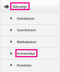Suosittelemme ensisijaisesti poistamaan ostolaskut näkymältä Siirretyt - Arkistoidut, jotta laskut on varmasti siirrettynä Kirjanpitoon ja Arkistoon ennen niiden poistoa.