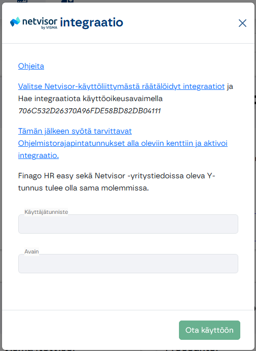 Rajapinta aktivoidaan Heeros HR:ssä kohdassa Organisaatiot → Liittymät. Netvisor integraatio otetaan käyttöön valitsemalla Ota käyttöön -painike, jonka kautta saat integraation käyttöoikeusavaimen 706C532D26370A96FDE58BD82DB04111. Tämä avain tarvitaan käyttöönoton loppuun viemiseen Netvisor palkanlaskennassa.