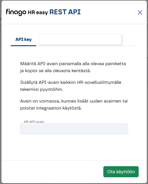 Rajapintatunnuksesta tarvitset käyttäjätunnisteen ja avaimen. Nämä tiedot lisätään HR:ssä Netvisor liittymän tietoihin, jotta saat API liittymän käyttöösi.