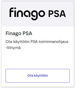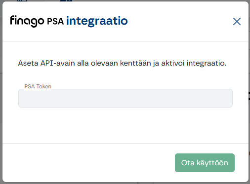 PSA-järjestelmässä luotava API-avain syötetään PSA Token -kenttään. Klikkaamalla Ota käyttöön saat erikseen sovitut tiedot liikkumaan järjestelmien välillä