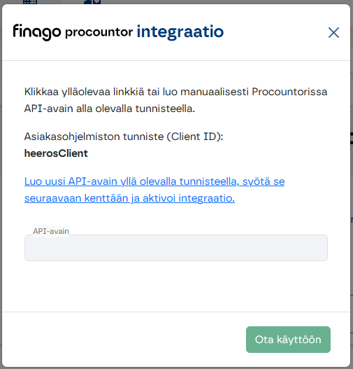 Liittymä-asetuksissa olevalla linkillä (suoraan Procountoriin) pääset aktivoimaan Procountoriaa liittymän valitsemalla oikeudet "käyttäjälle" heerosClient. Procountorista saatava avain tallennetaan API-avain -kenttään.