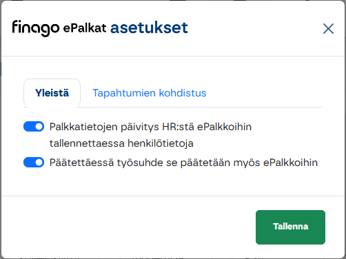 Oletusarvoisesti liittymän avulla päivitetään palkkatietoja HR:sta ePalkkoihin, mutta voit kytkeä tämän halutessasi pois päältä. Toisena vaihtoehtona on valita päätetäänkö työsuhde myös ePalkoissa kun se päätetään HR:ssä. Tässä tulee huomioida, että mikäli työsuhde päätetään automaattisesti myös ePalkoista, ei henkilöä voi enää nostaa maksuille esim. lopputilin laskentaa ja maksamista varten.