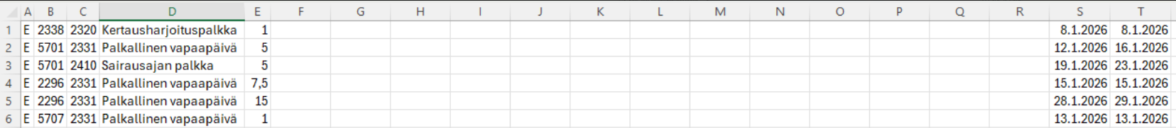 Aineisto on tarkoitettu vietäväksi palkanlaskentaan CSV-muodossa palkanlaskentaohjelman sisäänlukua varten.