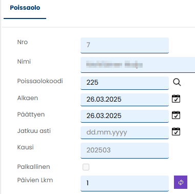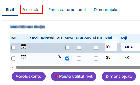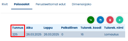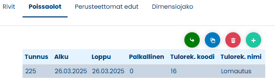 Maksuun liitetty poissaolo näkyy Poissaolot-taulukossa.