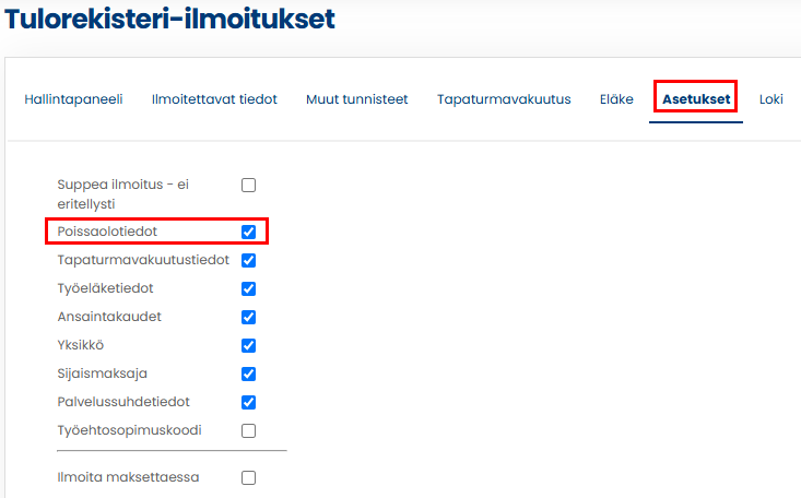 Ennen palkkatietoilmoituksen lähettämistä tulee Palkkatietoilmoituksen Asetukset-välilehdellä olla valittuna ilmoitettavaksi tiedoksi Poissaolotiedot.