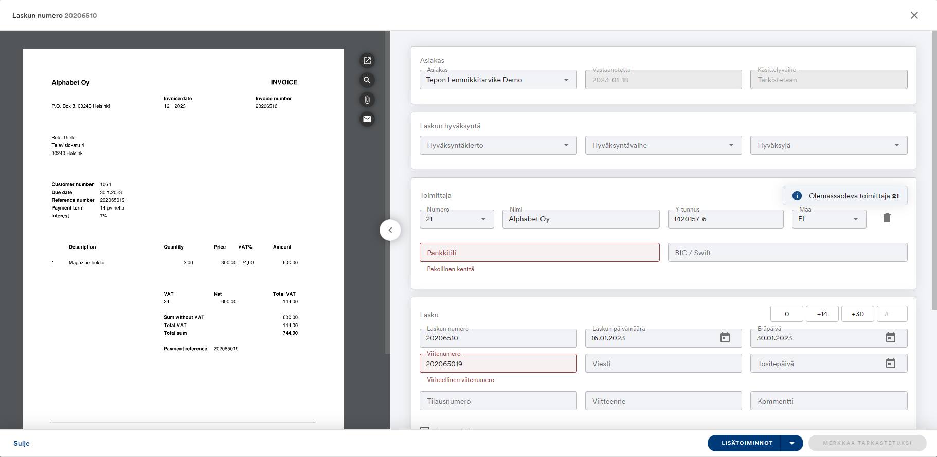 Laskun avaamisen jälkeen laskun kuva näkyy vasemmalla puolella ja laskun tarkastettavat tiedot oikealla puolella.