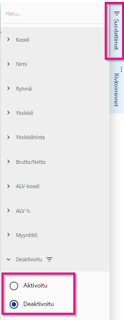 Tämän jälkeen listan suodatusasetuksia muuttamalla voidaan listalle taas tuoda vain aktiiviset tuotteet (Aktivoitu).