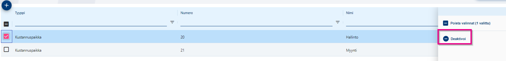 Jos käyttäjä haluaa nähdä tai käyttää laskentakohdetta uudelleen, tämä voidaan tehdä valitsemalla suodatin ja valitsemalla deaktivoidut laskentakohteet ja tämän jälkeen valitsemalla deaktivoitu laskentakohde ja aktivoimalla se uudestaan Aktivoi-toimintopainikkeen avulla.