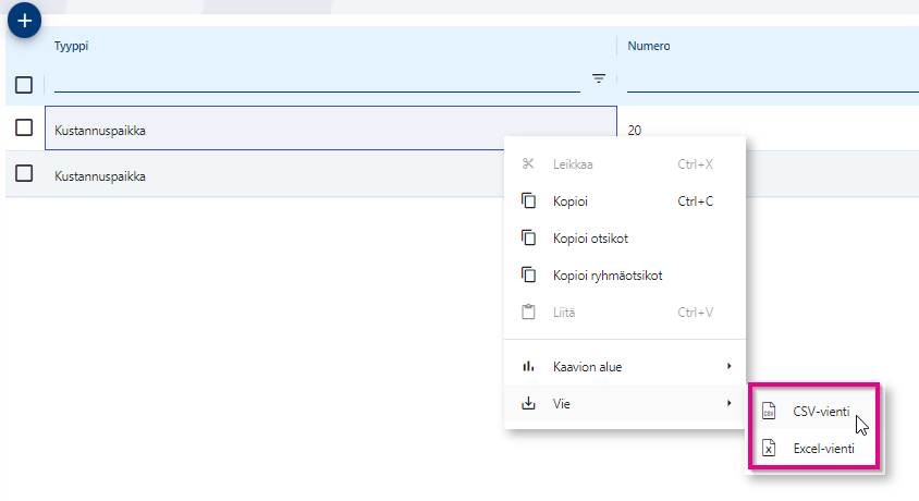 - Klikkaa hiiren oikeaa painiketta avataksesi pudotusvalikon, mistä valitaan Vie - CSV-vienti tai Excel vienti.