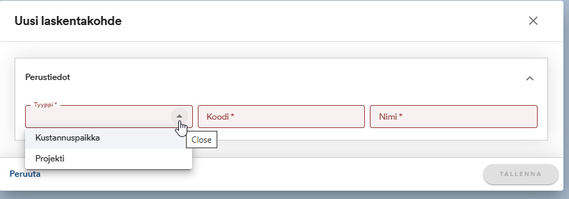 Tyyppi - Valitse tyyppi alasvetovalikosta. Laskentakohdetyypit määritellään yleisissä asetuksissa (Asetukset - Yleiset asetukset - Lasku-välilehti).